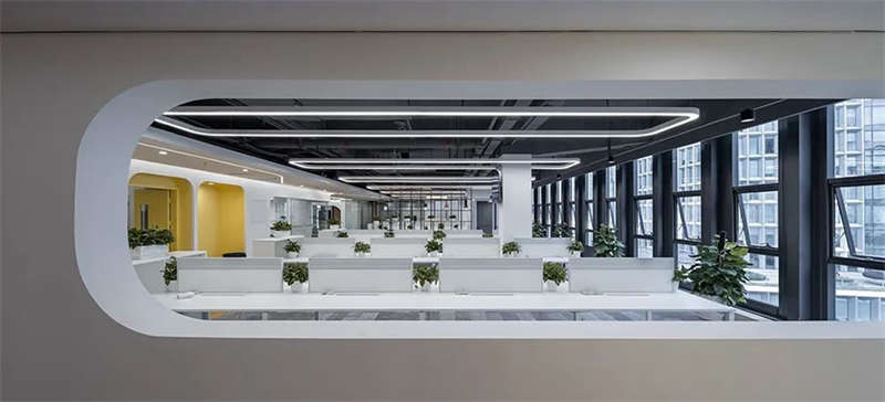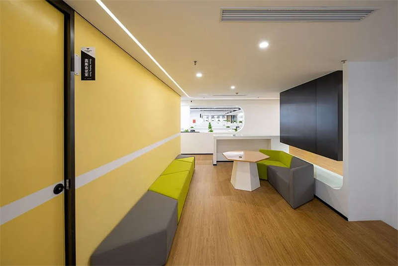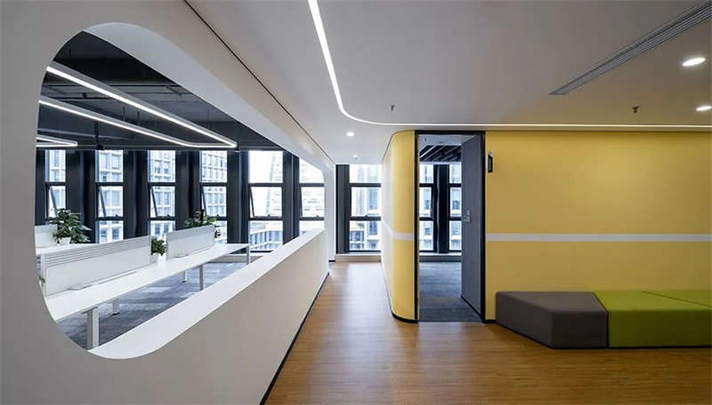 創(chuàng)意螺旋整合了電話間、頭腦風(fēng)暴室、開放討論區(qū)、餐吧等所有公共空間,獨(dú)立辦公室及會(huì)議室被布置在樓層兩端,使傳統(tǒng)的開放式卡位更加集中高效,并且預(yù)留了業(yè)務(wù)擴(kuò)張時(shí)增加卡位的可能。對(duì)外的接待和會(huì)議空間靠近電梯廳布置,減少外部人員進(jìn)入辦公區(qū)內(nèi)部造成的干擾。