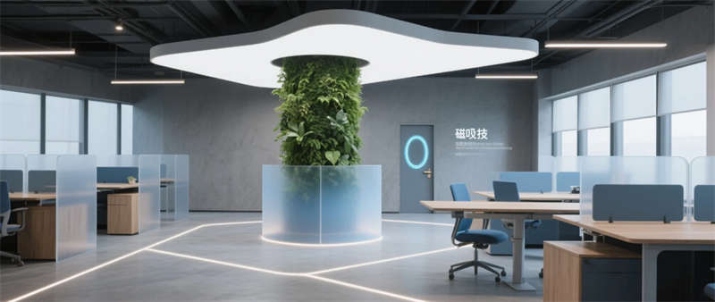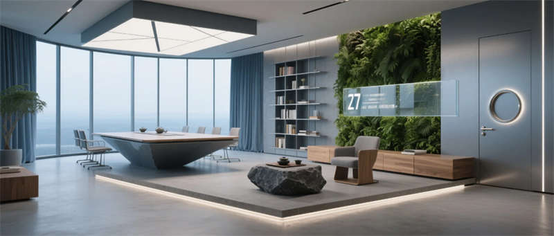 本項目以“未來生態辦公”為核心理念,打造1200㎡科技與自然交融的創新型辦公空間。設計采用啞光太空灰為主基調,通過霧霾藍企業色原木紋理的碰撞,在冷峻科技感中注入人文溫度??臻g以微水泥地面為基底,貫穿透光亞克力陽極氧化鋁材質,配合隱藏式線性燈帶的流動光影,構建出具有呼吸感的數字美學場域。