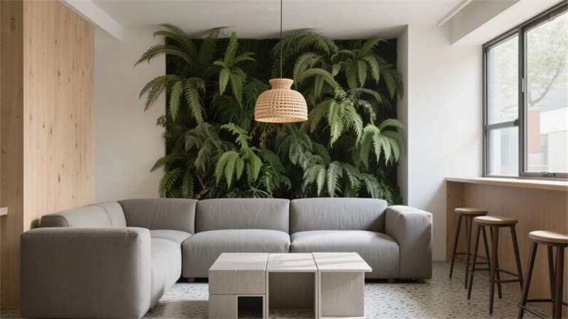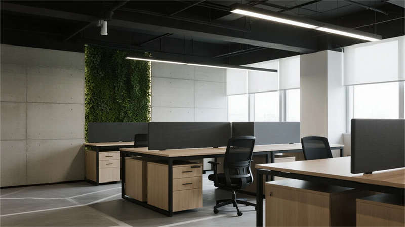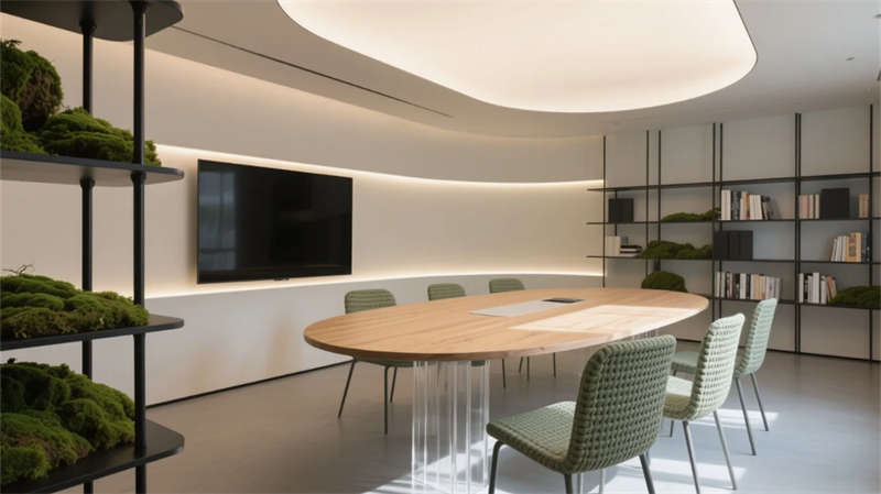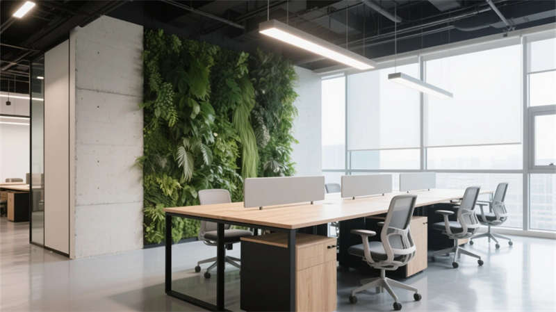 該空間以"自然共生"為脈絡,將輕工業基因與生態美學深度融合。裸露結構的天花與溫潤木元素形成張力,貫穿各區域的垂直綠植墻如同呼吸脈絡,賦予嚴謹辦公場景盎然生機。