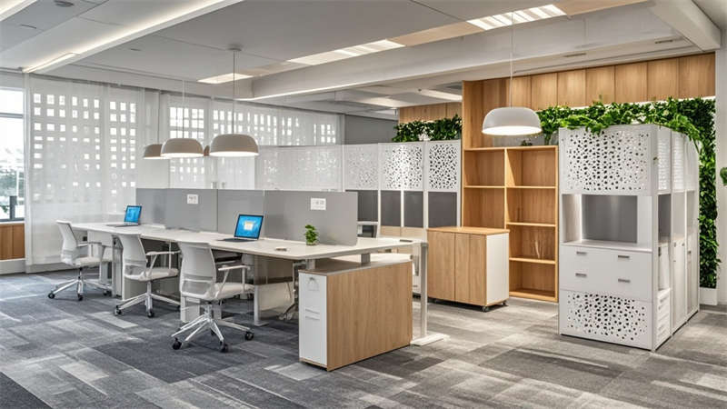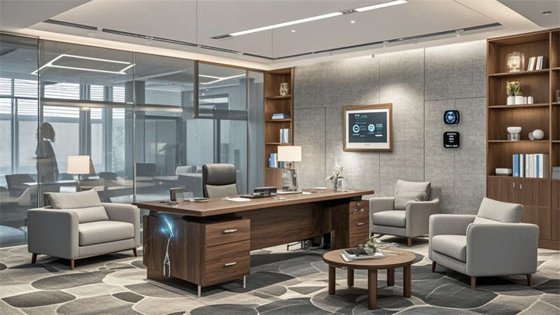 ④聲學(xué)吊頂確保35分貝以下靜音環(huán)境。色彩搭配采用70%淺灰奠定基調(diào),20%原木色增添溫暖,10%企業(yè)藍作為點睛色。環(huán)保方面選用LEED認(rèn)證材料,集成光伏玻璃幕墻年發(fā)電量達8萬度。