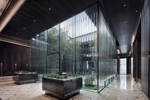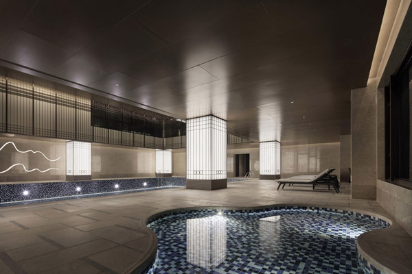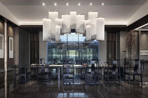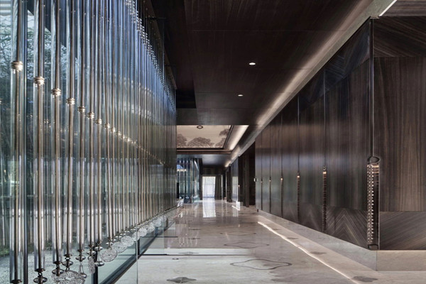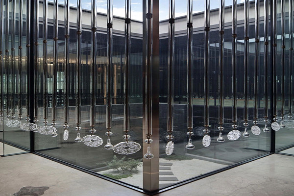 細(xì)致的從空間注入圓、點(diǎn)、線(xiàn),繁縟而有節(jié)配上雅致玻璃吊飾,自然光映出流光溢彩,水的意象呈現(xiàn)東方肌理,光影交織突顯五重院落的建筑,彰顯東方大境。