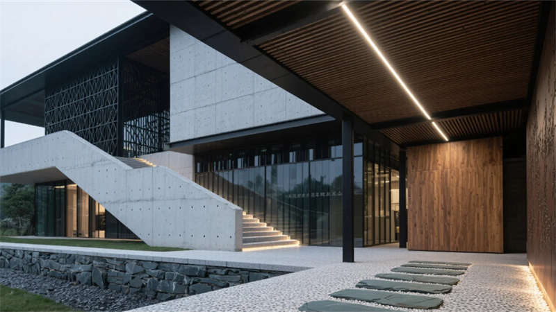 建筑外觀以滁州竹海為靈感,斜交網(wǎng)格結(jié)構(gòu)勾勒出山勢輪廓,穿孔鋁板在光影間呼吸。懸浮橡木雨棚如云中棧橋,將自然意象引入現(xiàn)代語境。青石板基座延伸至室內(nèi),形成連貫的在地敘事。