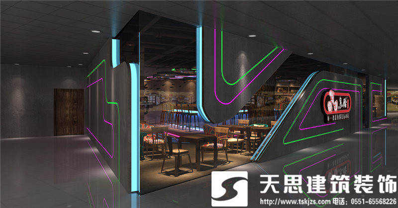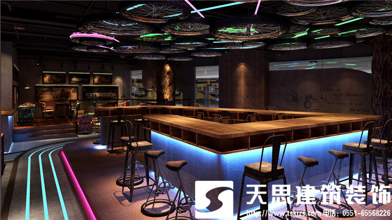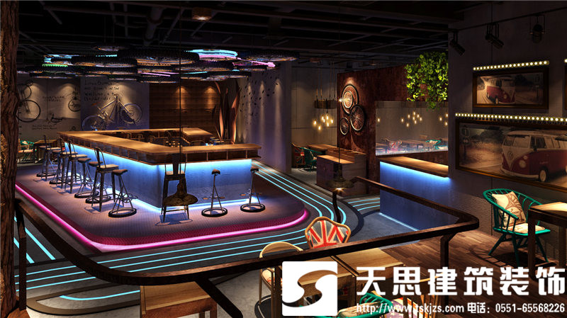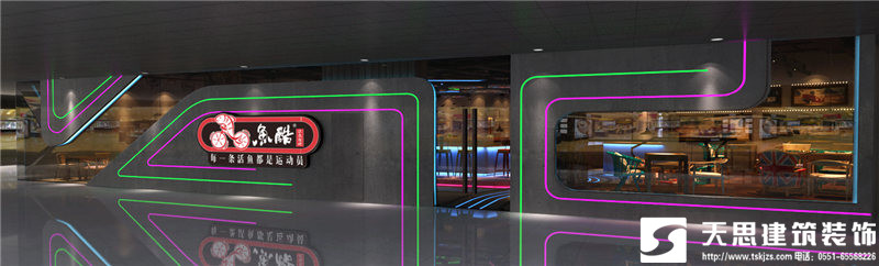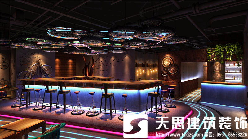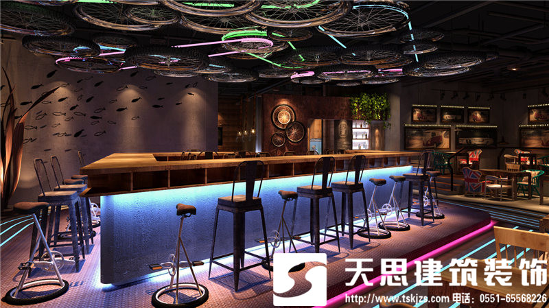 本項目的設計采用魚酷的LOGO跑道作為設計的核心點,體現一個“活”字,自行車輪胎為輔助增強裝飾性和動態感。魚酷,剝離了傳統燒烤的呆板模式,讓空間活泛而浪漫。