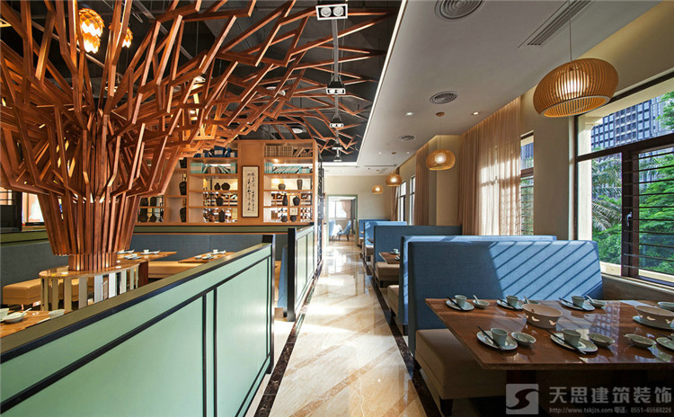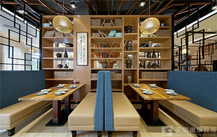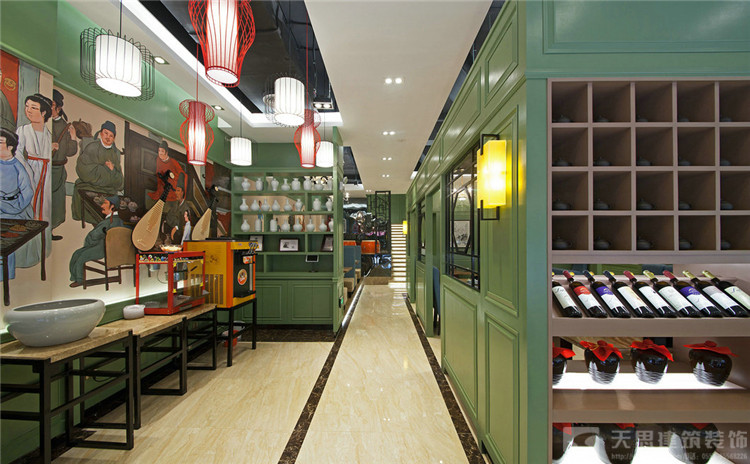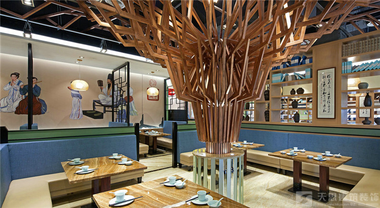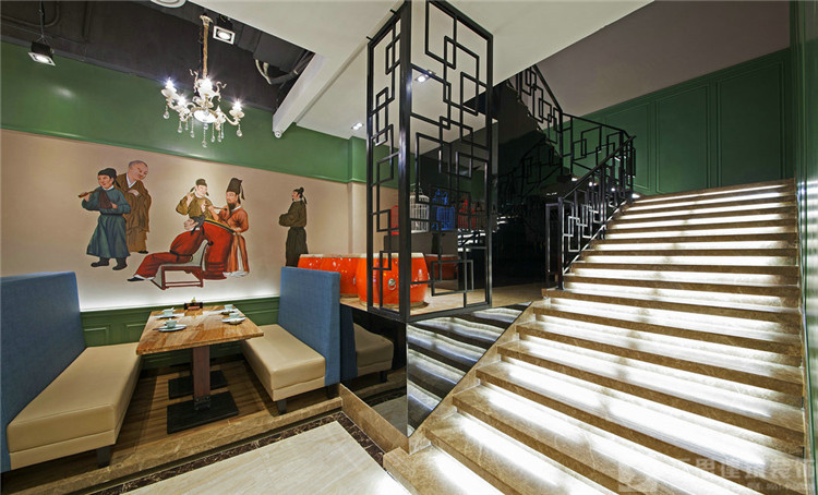 夜宴餐廳以五代十國時南唐畫家顧閎中的作品《韓熙載夜宴圖》為創作靈感來源,通過“聽彈琵琶”,“集體觀舞”,“中間休息”,“各自賞月”。“依依惜別”,等五個章節來還原當時的盛況,通過畫中設計元素提煉,及色彩的組合,達到客戶用餐的體驗感。
