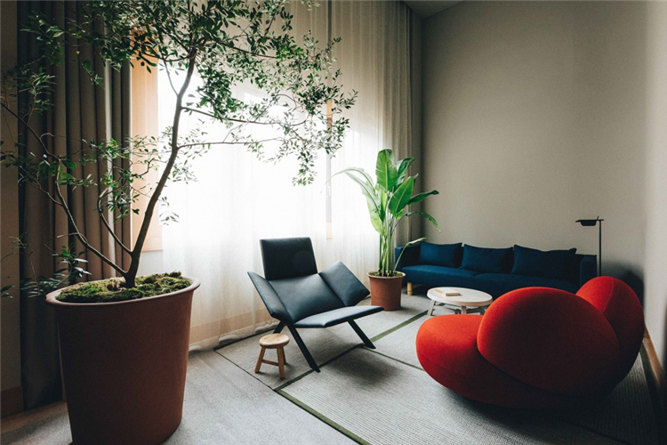 酒店的客房同樣色彩斑斕。客房的開放空間中央立有大型紗柱,懸掛著自然染色的靛藍色漸變織物。客房空高開闊,四周擺設有CKR設計的沙發,皮革躺椅及一系列盆栽裝飾。同時,房間內配有唱片機及精選的黑膠唱片,為房間帶來了親切感。房間內的照明采用特別設計的燈具,其中以定制的紙質燈最具特色。此外酒店客房,套房及復式套房中,都采用了紡織品裝飾的定制雙人沙發。