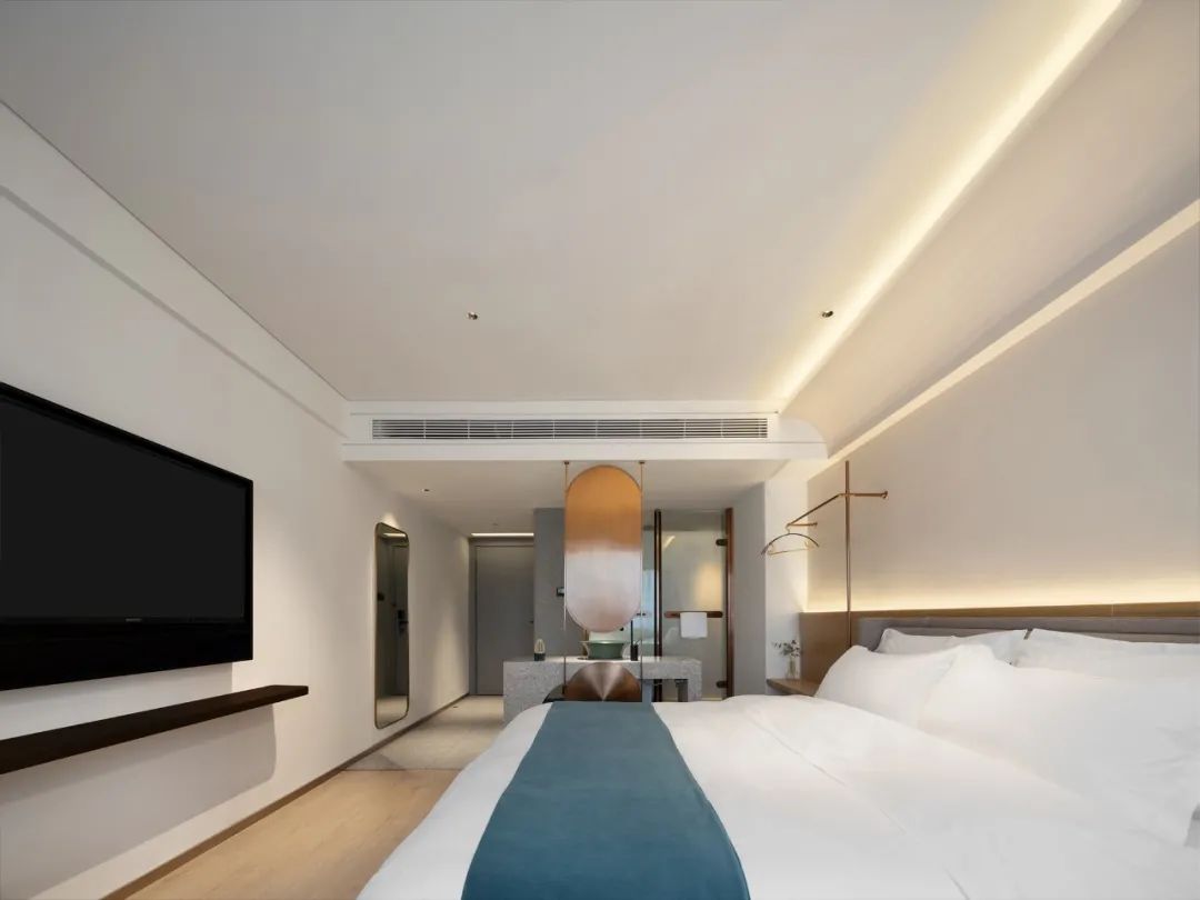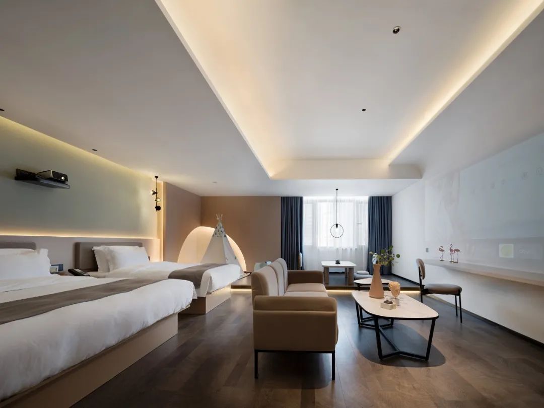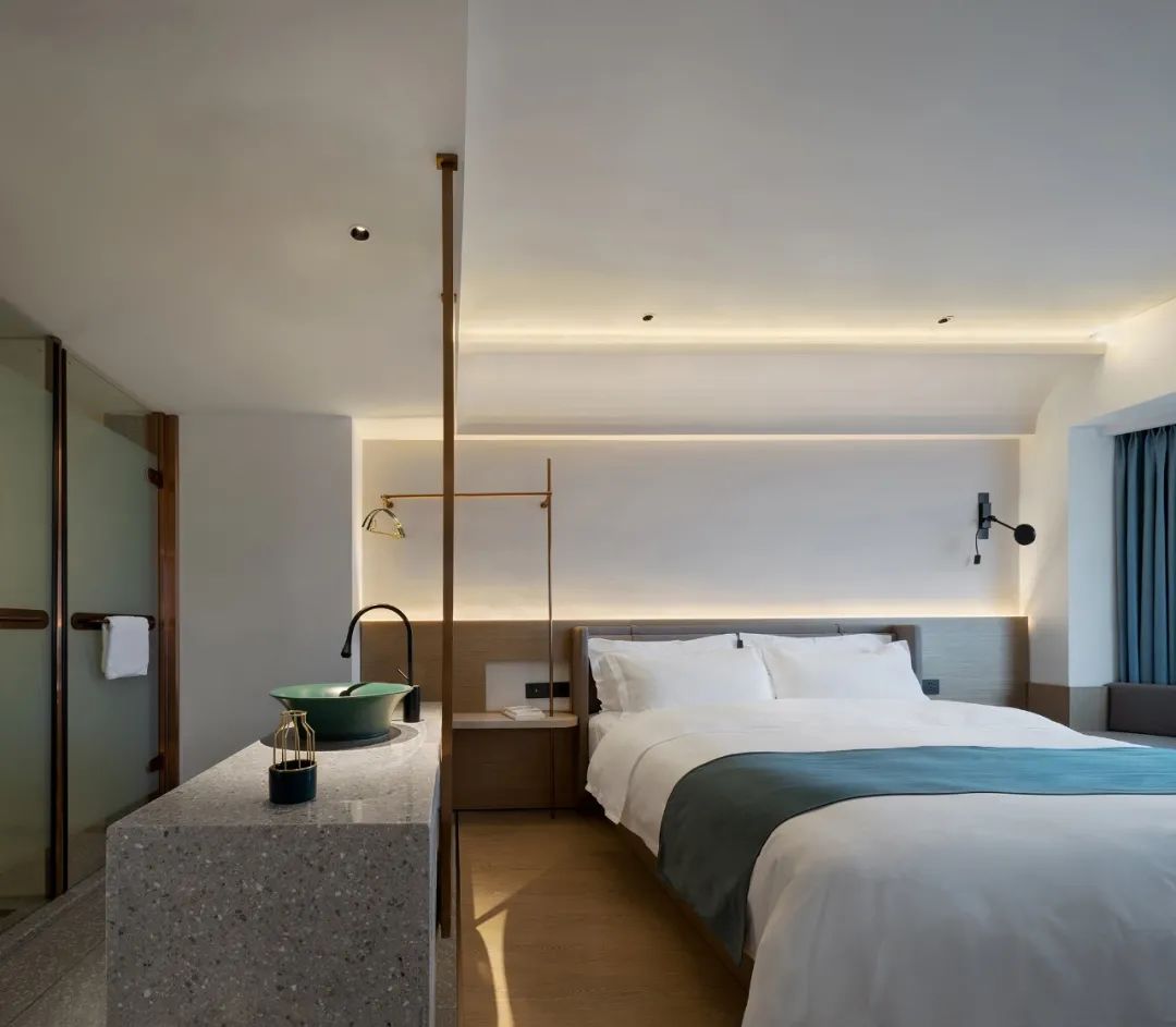 在線條曲度與建筑結構的銜接中交融出感性層面的驚喜,令入住者“循著光”下榻酒店,在體驗與感受中為空間注入當下的即時形態,由此,人在空間里是造訪者亦是著境者,是觀賞者,亦是參與者。情與境中,無盡遐思。