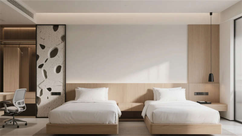 客房以中性色調(diào)為基底,亞麻、柚木與肌理墻面營(yíng)造松弛感,智能化系統(tǒng)隱于無(wú)形,從電動(dòng)紗簾到無(wú)線充電桌,細(xì)節(jié)中滲透科技溫度。雙床房的可移動(dòng)屏風(fēng)與定制家具,兼顧私密與靈活;衛(wèi)浴空間以霧面玻璃與水磨石打造朦朧質(zhì)感,啞光五金件點(diǎn)綴現(xiàn)代精致。餐廳以共享長(zhǎng)桌與綠植墻激活社交氛圍,水磨石地面鑲嵌的黃銅線條如溪流蜿蜒,呼應(yīng)徽派建筑中的流水意象。健身房鏡面與橡膠地面反射城市燈火,休憩區(qū)的皮質(zhì)軟榻與漸變燈光,為運(yùn)動(dòng)后提供片刻寧?kù)o。