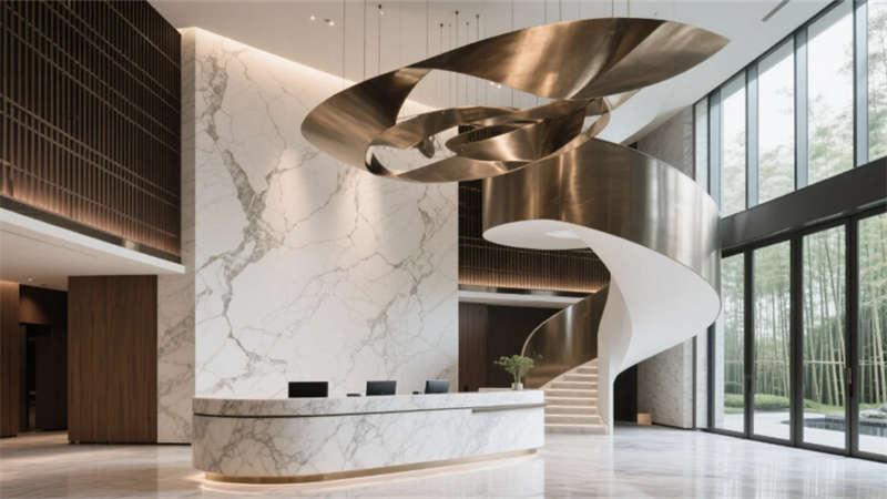 這座酒店以自然與人文的共生為靈感,將徽州山水意境凝練于現(xiàn)代設(shè)計(jì)語(yǔ)言中。建筑外觀以幾何切割的洞石立面與通透玻璃幕墻交織,垂直綠植如水墨筆觸般攀附墻體,入口處鏡面水景倒映天光云影,模糊建筑與自然的邊界。步入大堂,挑高空間內(nèi)懸浮的螺旋樓梯與抽象金屬裝置形成動(dòng)態(tài)視覺焦點(diǎn),暖木格柵與冷冽大理石碰撞出靜謐與奢華的平衡,全景窗將庭院竹林景觀引入室內(nèi),光影隨時(shí)間流轉(zhuǎn)而變幻。
