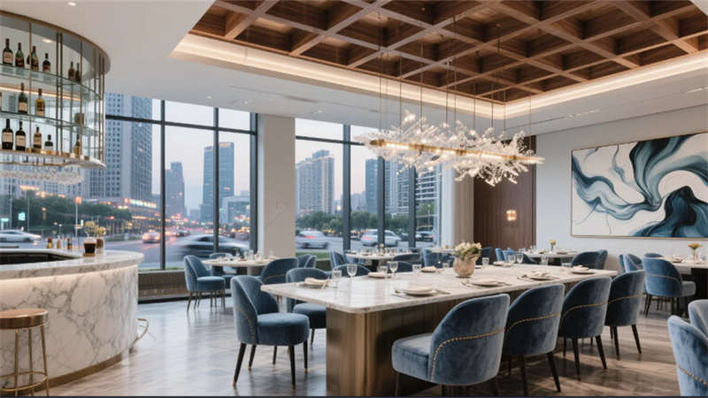步入挑高大廳,懸浮水晶燈傾瀉柔光,旋轉(zhuǎn)樓梯以雕塑形態(tài)定格動態(tài)美學(xué),綠植墻與大理石的對撞詮釋自然與精致的共生。全日餐廳借落地窗框景四季,絲絨餐椅與光影交織出慵懶的晨昏;行政酒廊夜幕降臨時化身空中藝廊,星空天花與城市燈火共舞,霧化玻璃切換著商務(wù)與私享的邊界。