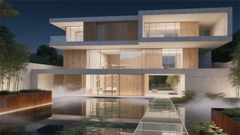 穿過懸浮玻璃步道,下沉庭院以枯山水礫石為紙,霧森系統織就流動的薄紗,銹鋼板花壇中蕨類舒展,嵌入式篝火躍動的暖光與冷調混凝土碰撞,喚醒人對原始自然的感知。挑高的大堂內,混凝土旋轉樓梯切割空間,透光云石墻面在晨昏光線中暈染出水墨質感,線性光帶如星軌劃過,將窗外竹影引入室內敘事。