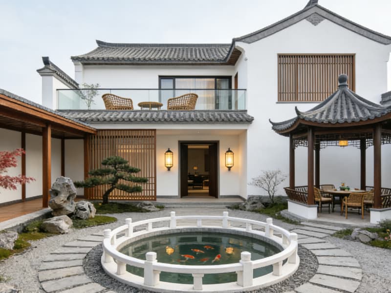 空間布局上,科學(xué)劃分公共區(qū)域與私密客房兩大板塊,公共區(qū)包含庭院、茶室、餐廳、書吧等功能區(qū),庭院植入徽派馬頭墻元素與青石板小徑,搭配枯山水景觀與原生綠植,營造靜謐雅致的入戶氛圍;茶室采用實(shí)木茶桌與半通透屏風(fēng),墻面懸掛徽州版畫,為客人提供品茗交流的休閑空間;餐廳以暖木色為主調(diào),配備開放式明檔廚房,兼具特色餐飲與小型聚會功能;書吧陳列安徽地域人文書籍,搭配柔軟布藝沙發(fā),打造放松閱讀的靜謐角落。