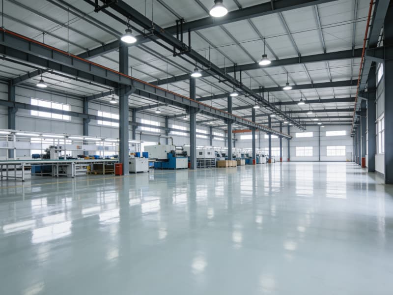 步入內部,生產區域空間開闊,頂部采用裸露的鋼梁結構,搭配軌道式的照明燈具,保證充足且均勻的光線,滿足高強度的生產作業需求。地面鋪設耐磨的環氧樹脂地坪,不僅耐用,還易于清潔和維護。