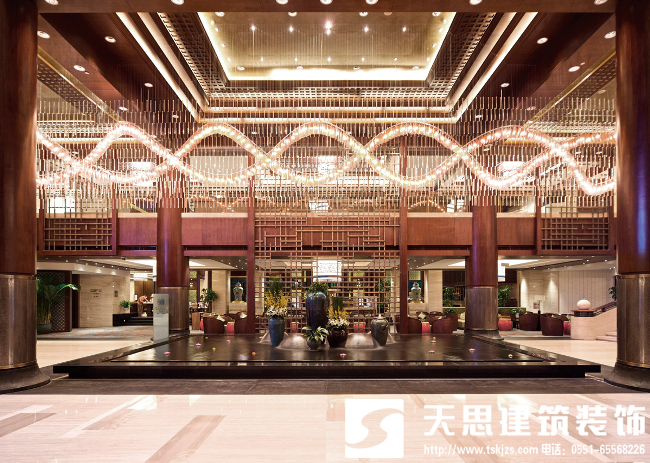 大堂的另一個風格以抽象的格柵為裝飾,在中央景區的水景以寧靜來突出水的主題,并以木格柵與水景組合成抽象的構成。吊燈以水泡燈作為裝飾,有溫泉氣泡的隱喻,突出酒店設計的主題。