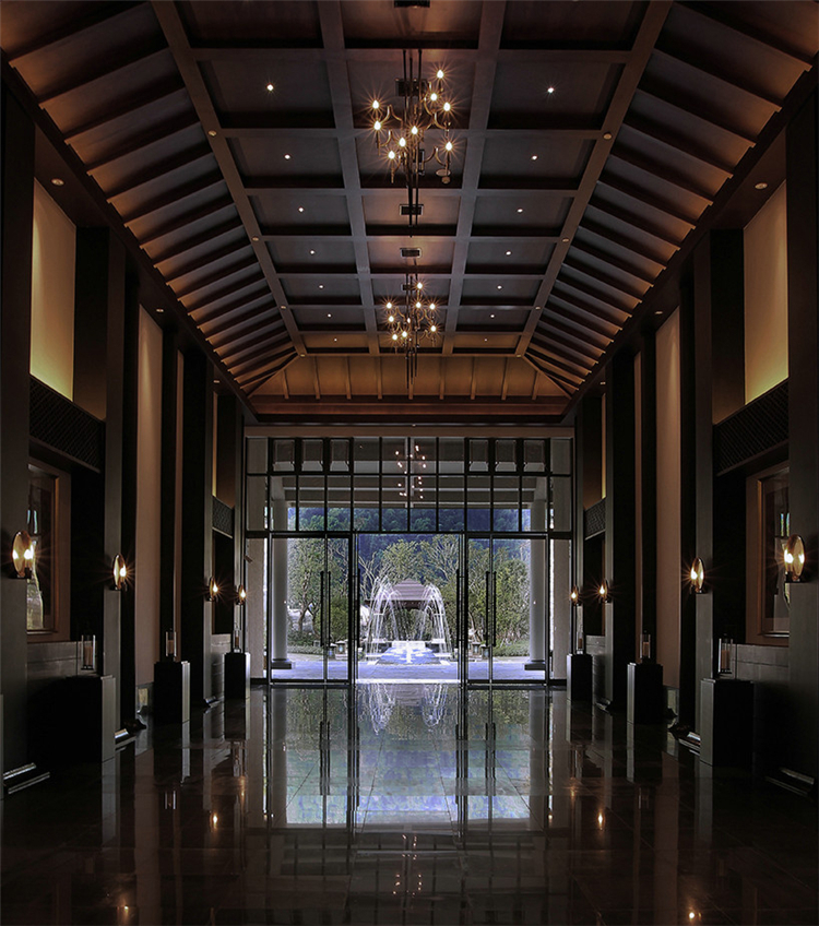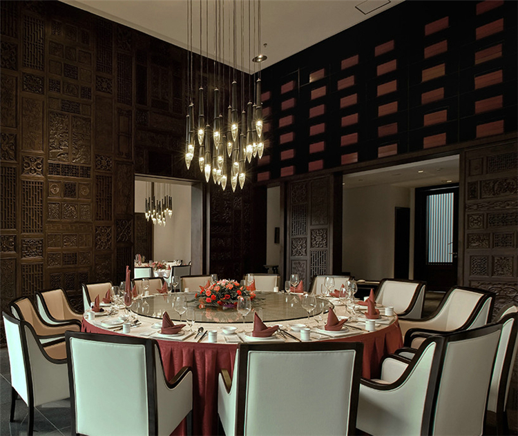 穿過悠長的走道,在灰白色空間配合溫暖沉著木色格子窗棱,讓客人逐步感受一種優雅的熱情。天花的黑色線條設計,帶有極強的導向性,墻面上特別設計的壁燈,與柱體結合,極大地豐富整個空間的層次感和趣味性。