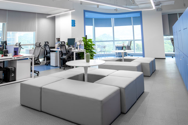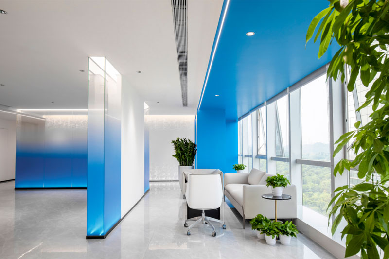 藍(lán)色散發(fā)出理性、包容與思考,暗含著公司對(duì)品質(zhì)的追求,將公司的“創(chuàng)新、科技、便捷”的理念流露在空間之中。