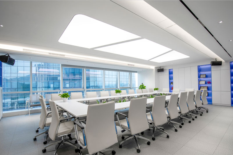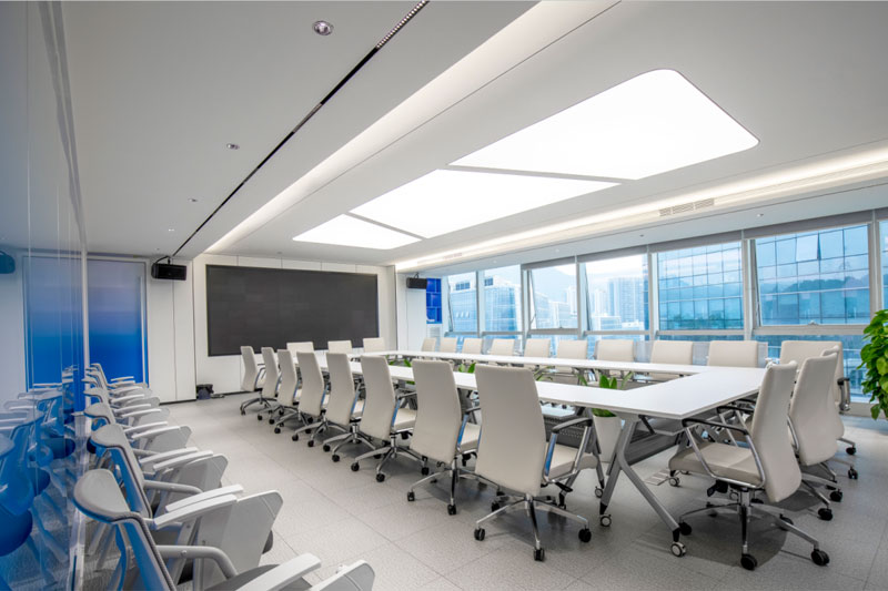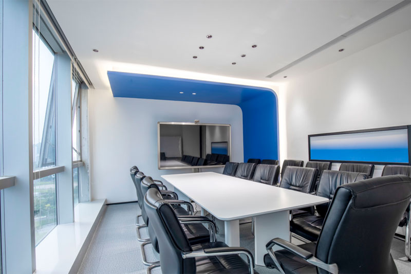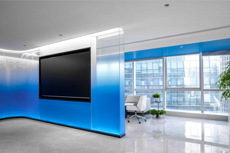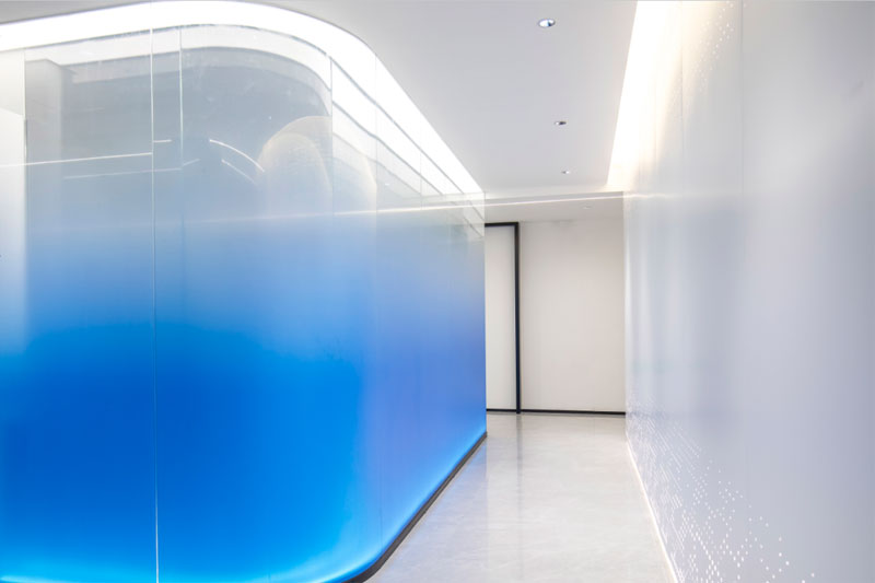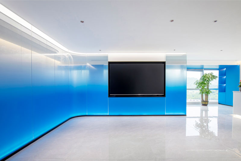大小會(huì)議室都延續(xù)了空間的藍(lán)色基調(diào),利用通透的藍(lán)色玻璃分隔過(guò)道,使空間更加通透明亮,不僅讓視感增強(qiáng),也深刻的加強(qiáng)了品牌形象在訪(fǎng)客心中的作用。