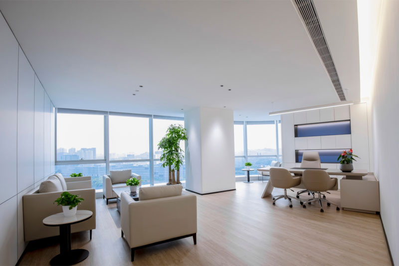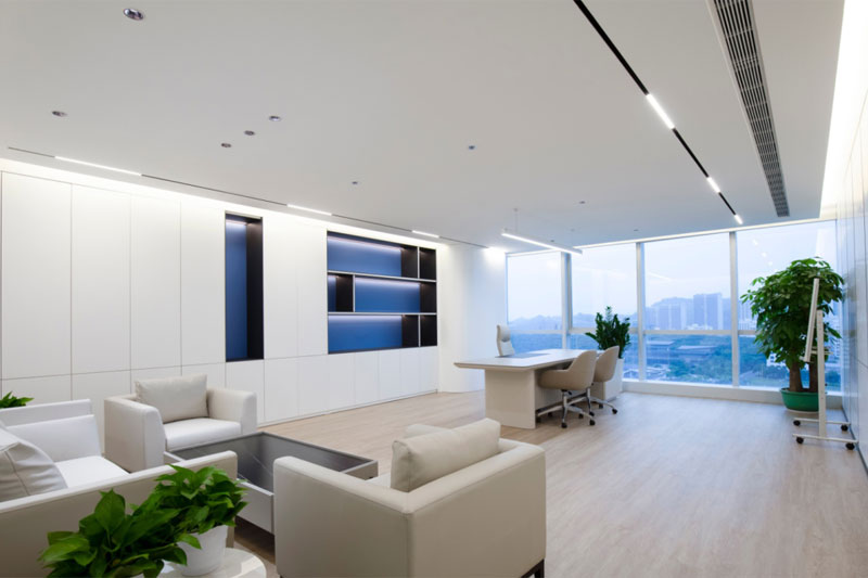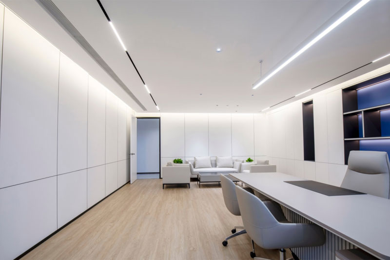 總裁辦整體空間體塊分明,大面積的木飾面體現(xiàn)出品質(zhì)和細(xì)節(jié),藍(lán)白的色調(diào)與空間功能的巧妙搭配,輕盈的空間蕩漾著優(yōu)美的旋律感。