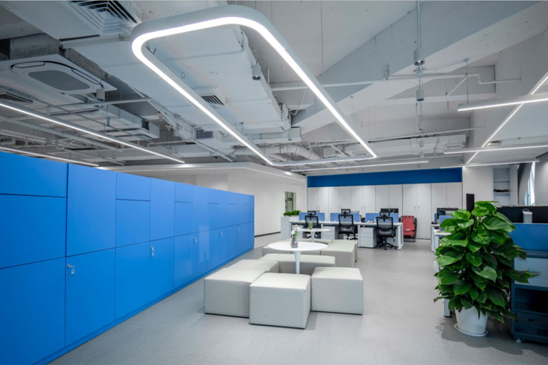 為了體現(xiàn)客戶(hù)的品牌形象和影響力,設(shè)計(jì)師將“創(chuàng)新、科技、便捷”的理念融入到空間的每個(gè)環(huán)節(jié),從企業(yè)的VI色中提取出藍(lán)色運(yùn)用到整體空間中。