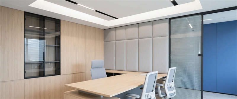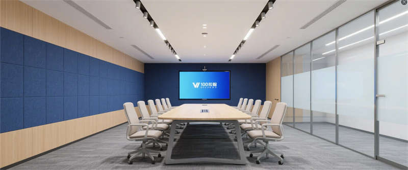 智能會議室:深藍(lán)色吸音墻面呼應(yīng)企業(yè)VI色,智能屏幕與玻璃隔斷凸顯科技屬性;